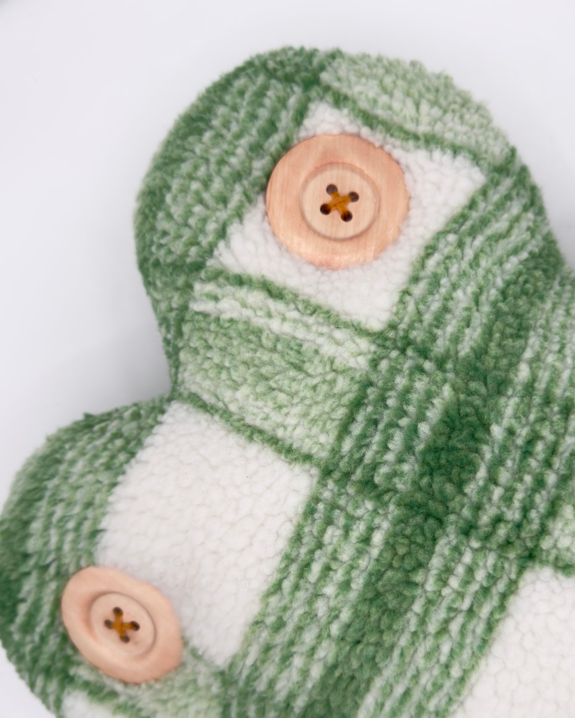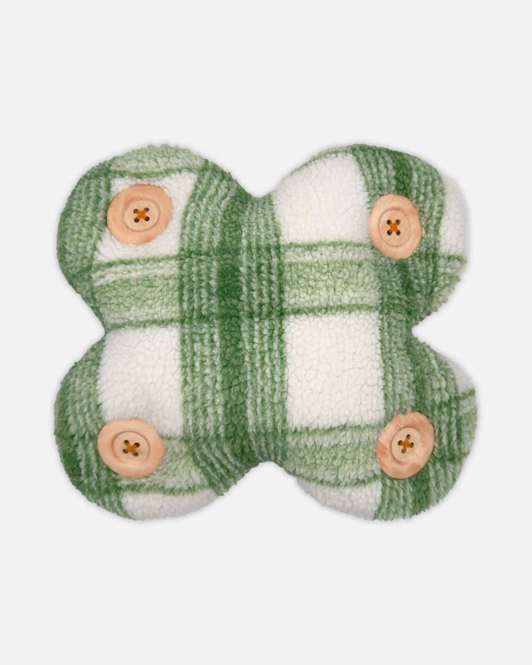 Plaid sherpa clover plushie with four wooden buttons